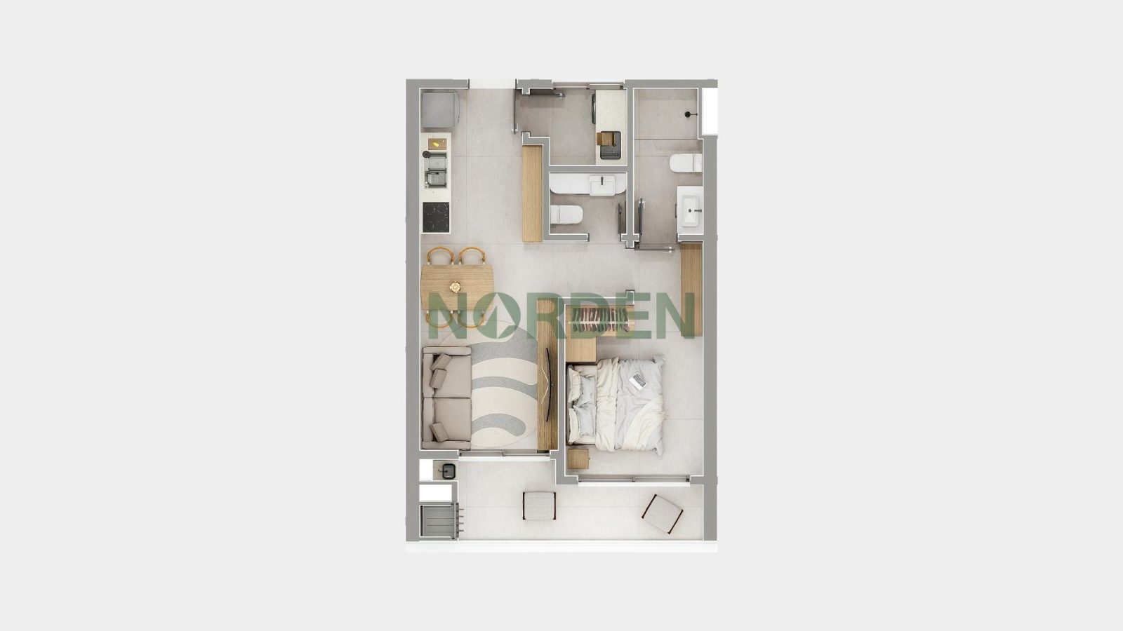 Com 55,29m² privativos, a unidade 305 do Áurea Marina oferece uma planta inteligente e elegante, ideal para quem busca conforto a poucos passos do mar.