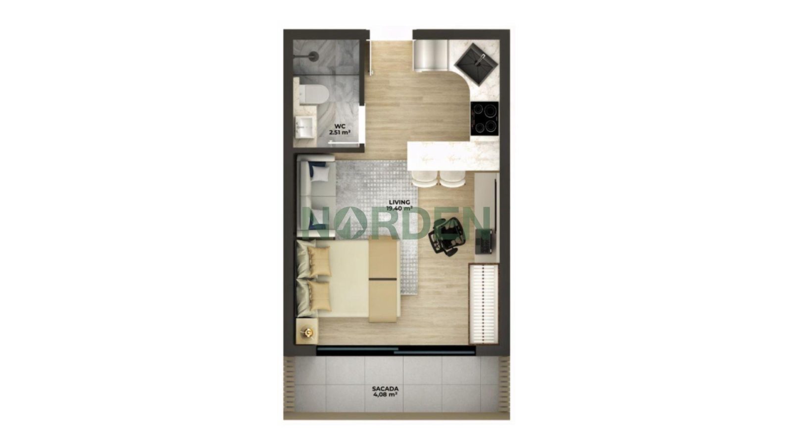 Compacto, mas com personalidade e sofisticação, o Studio Premium traz 25,04 m² internos cuidadosamente planejados para maximizar cada metro quadrado, além de 4,89 m² de área externa que permitem criar seu cantinho de lazer ou descanso ao ar livre. A orientação Norte garante iluminação natural constante, tornando o ambiente mais acolhedor e aconchegante. É o espaço ideal para quem busca autonomia, conforto e modernidade, sem abrir mão de um lar que reflete seu estilo de vida contemporâneo.